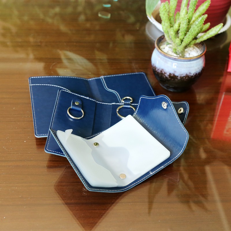 名片冊,雙層皮對裱,四周車線,有銀色按扣,散邊,圓角。內里有18張PVC名片袋,有模切。