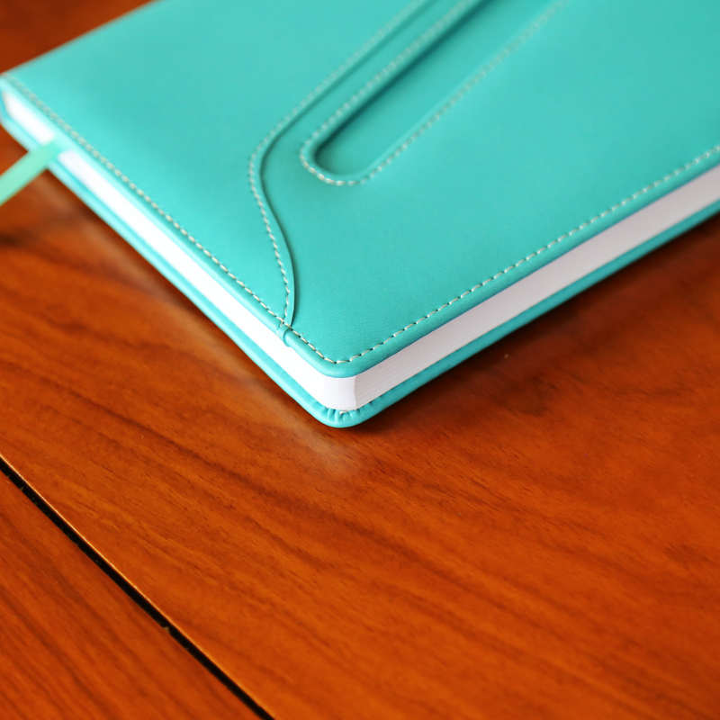 封面普通PU材料,同料拼接,有模切筆插位,15mm松緊帶筆插,1.5mm灰板,有海綿,四周踩線和面線,圓背圓角